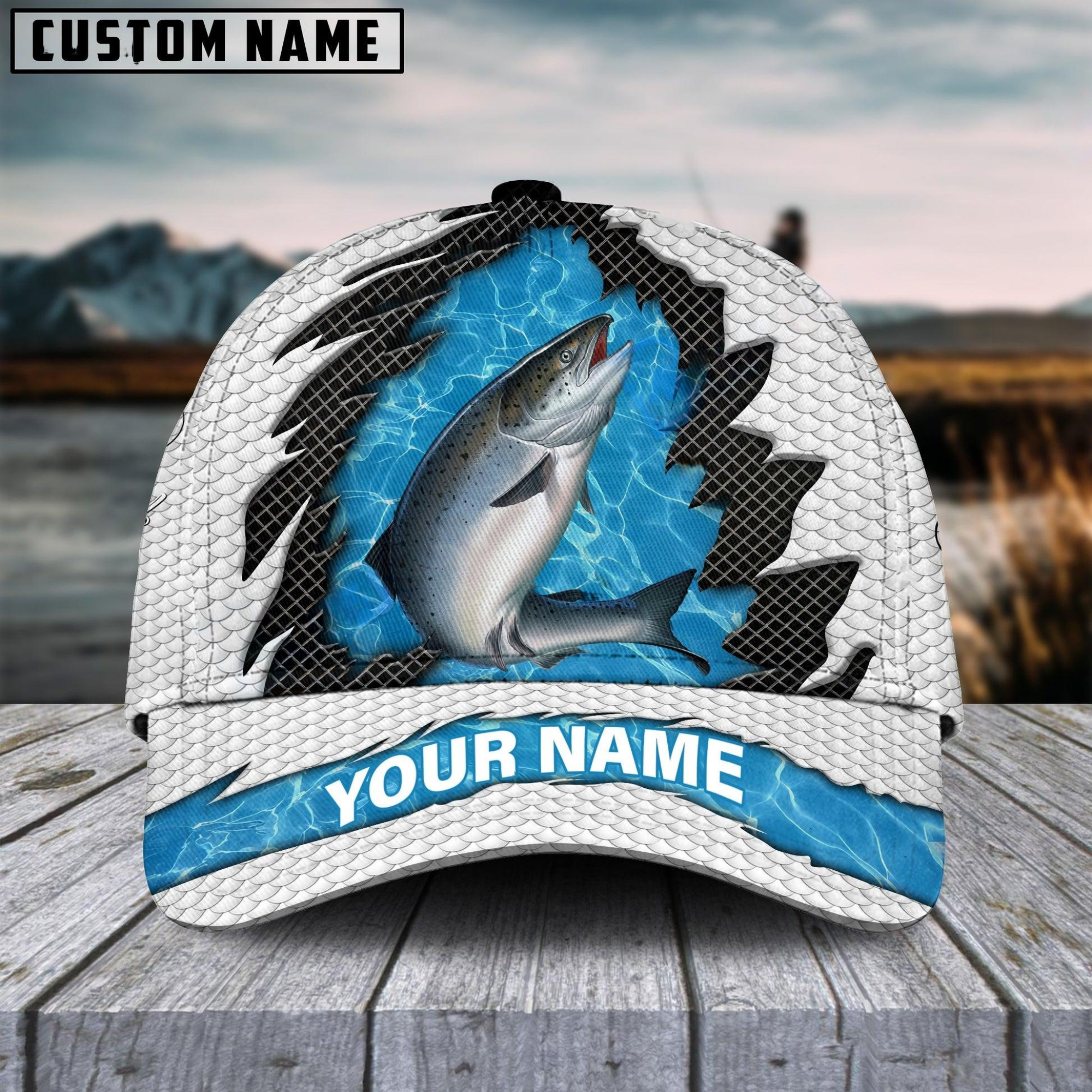 Blisscorners Salmon Fishing White Blue Wave Fishnet Customized Name 3D Cap
