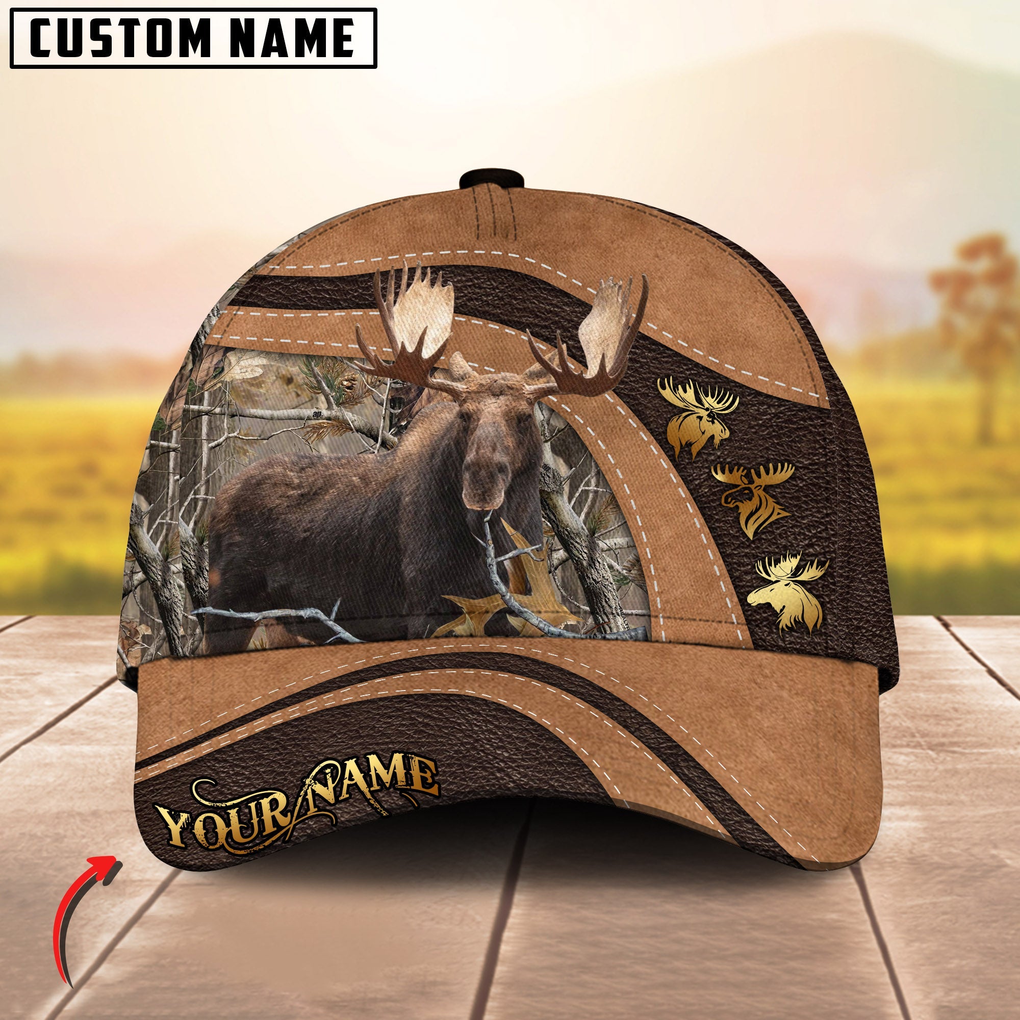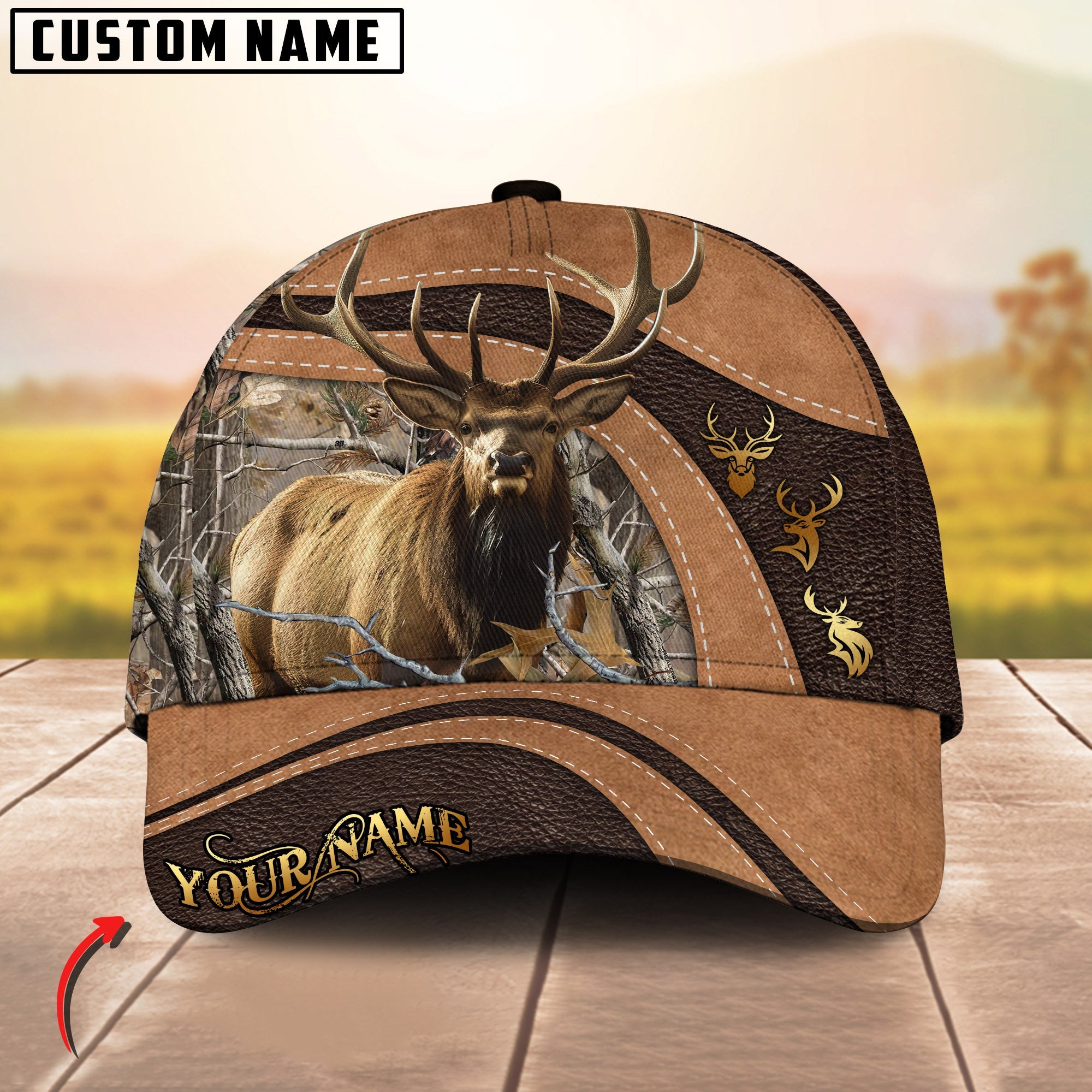Blisscorners Golden Deer Hunting Realistic Buck Head Leather Pattern Personalized Name 3D Cap (6 Options)