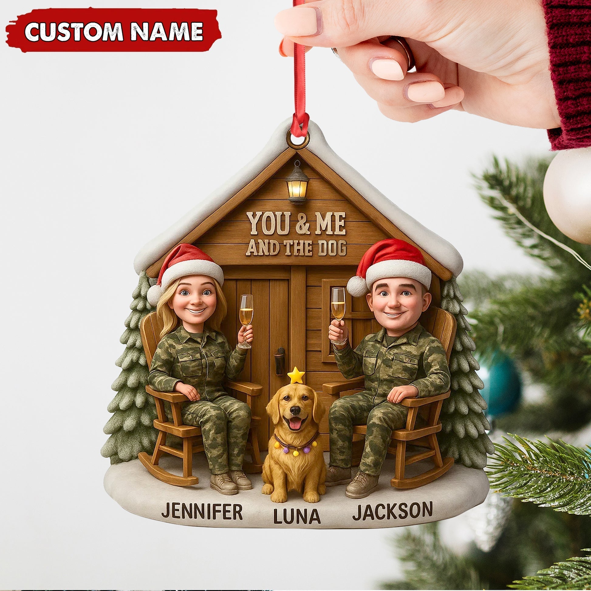 Blisscorners Personalized Hunter Couple Dog Christmas Ornament, Custom Name “You and Me and the Dog” Cabin, Cute Hunting Family Pet Lover Gift