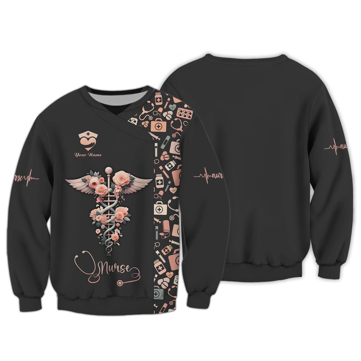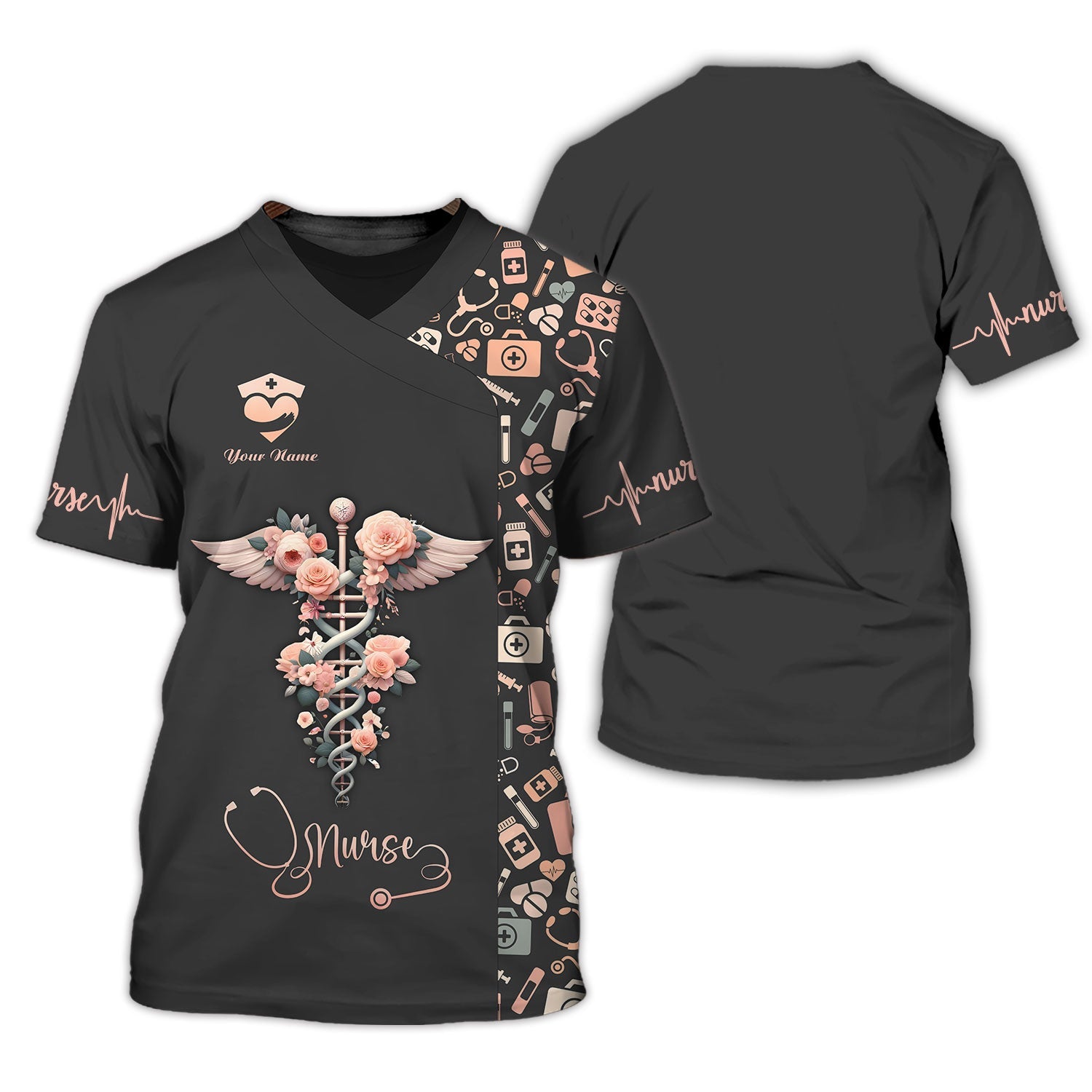 Blisscorners Personalized Nurse Shirt, Floral Caduceus with Angelic Wings Design