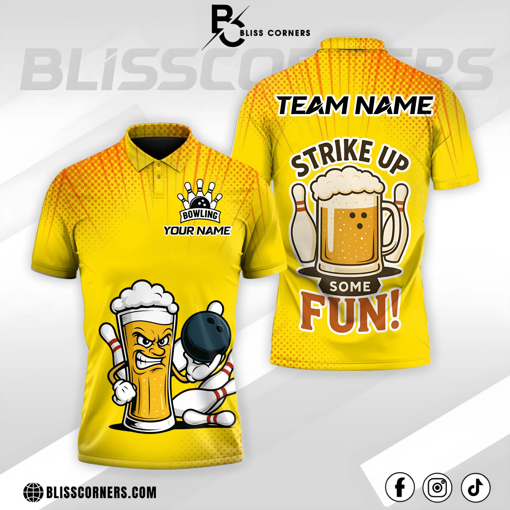 Blisscorners Bowling Beer Strike Shirt Funny Yellow Personalized Name, Team Name 3D Shirt